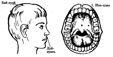 Описание: проводится поочередный массаж точек: БАЙ-ХУЭЙ, ИНЬ-ЦЗЯО, ДУЙ-ДУАНЬ.
