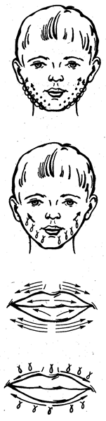 Описание: разминание губ от середины к углам.