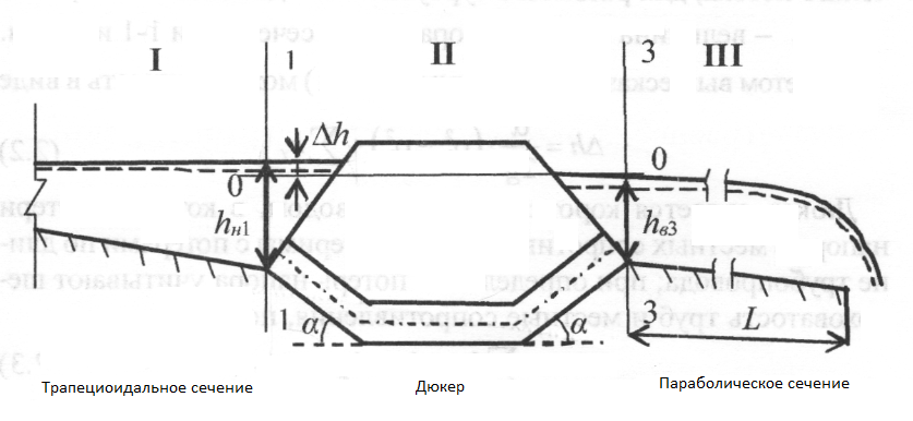 Схема системы состоящей из каналов трапециедального и пароболического сечений, соединенных ж/б дюкером.