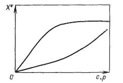 Рис 20-1. Выпуклая и вогнутая изотермы адсорбции