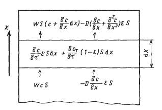 (дс/дτ) εSdx+ дсT/ дε(1-ε)Sdx= -w(дс/дх)Sdx+D(д 2c/дx2) ε Sdx