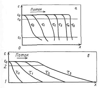 Рис. 20-4. Движение фронта сорбции по слою адсорбента при выпуклой (о) и вогнутой (б) изотермах