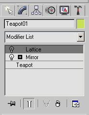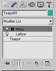 Стек модификаторов очень удобен, так как содержит полную историю трансформации объектов сцены. При помощи стека модификаторов можно быстро перейти к настройкам самого объекта и примененных к нему модификаторов, отключить действие модификаторов или поменять местами очередность их воздействия на объект. При выделении объекта или примененной к нему команды параметры объекта появляются на вкладке Modify (Изменение) командной панели под стеком модификаторов.