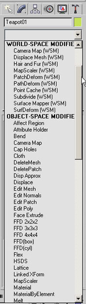 Чтобы применить к объекту модификатор, нужно выделить объект и выбрать модификатор из списка Modifier List (Список модификаторов) на вкладке Modify (Изменение) командной панели (рис. 4.2). При этом название модификатора сразу появится в стеке. Назначить модификатор объекту можно также, воспользовавшись пунктом главного меню Modifiers (Модификаторы).