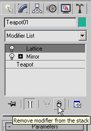 Для удаления назначенного модификатора необходимо выделить его название в стеке модификаторов и нажать кнопку Remove modifier from the stack (Удалить модификатор из стека), расположенную под окном стека модификаторов (рис. 4.3).