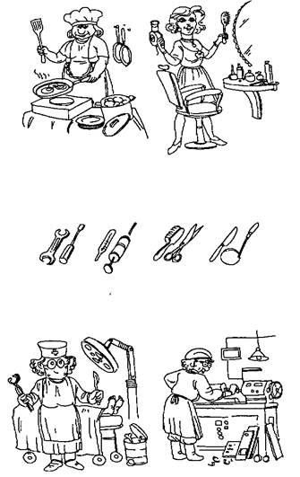 Детям нужно назвать профессию и род занятий каждого человека, изображенного на картинке (рис. 4), а затем показать стрелкой и рассказать, кому какие предметы понадобятся в работе.