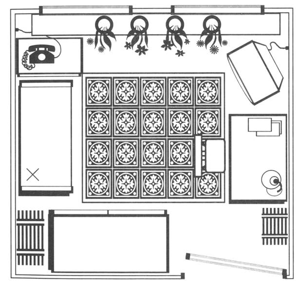 • «Найди предмет по плану». Для этой игры необходимо нарисовать план комнаты, в которой вы будете играть. Один из игроков прячет в комнате предмет и указывает его каким-либо условным знаком на плане (например, ставит крестик, как на рисунке). Второй игрок должен, руководствуясь только планом комнаты, найти спрятанный предмет.