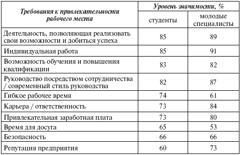 Согласно результатам исследования привлекательность рабочего места для представителей внешнего (студенты) и внутреннего (молодые специалисты) рынков труда несколько различается. Работа «со стороны» кажется привлекательной при таких доминирующих признаках, как возможность реализовать себя, «бросить вызов», выполняя работу индивидуально, шансе профессионального развития и отсутствия директивного управления со стороны руководителя. «Изнутри» трудовая деятельность видится привлекательной прежде всего при возможности выполнять работу индивидуально (самостоятельно); самореализоваться – при сотрудничестве с руководителем, а не под его жестким контролем, построить карьеру и иметь «приличное содержание». Достоверная информация о привлекательности рабочих мест может стать объяснением поведения работников и соискателей должностных позиций. Кроме того, данные подобного рода исследований могут быть использованы при сегментировании рынка труда. Последующая обработка информации по каждому из сегментов является основанием для формирования специфической для каждого из них политики работы с персоналом.
