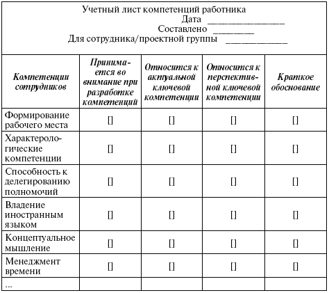 Для проведения оценки наличия компетенций у работников может разрабатываться учетный лист компетенций, в содержании которого должна быть информация об основных компетенциях работников, представленная в виде их перечня, и предполагаемых к достижению ключевых компетенциях работников (рис. 5.1).