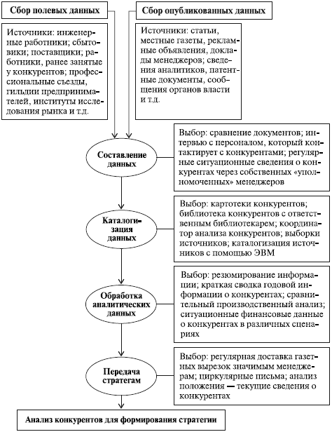 Сопоставление данных обоих каналов позволяет их систематизировать в соответствующих каталогах, а затем посредством резюмирования, сравнительного финансового, а также производственного анализа – формулировать первичную обобщающую информацию. Дальнейшая адресная рассылка информации заинтересованным структурным подразделениям организации или ответственным менеджерам дает возможность провести квалифицированный анализ предприятий-соперников и сформировать стратегию деятельности в выбранных сегментах с учетом его результатов.
