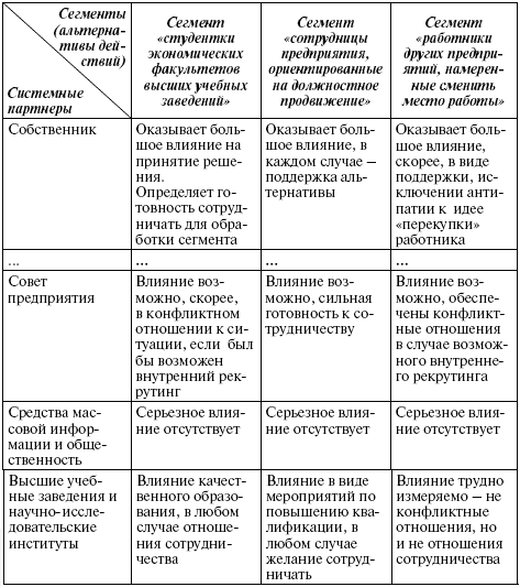 В ряде случаев степень возможного влияния системного партнера на деятельность предприятия на рынке труда выявить довольно сложно. Если степень влияния не определена, но выявлена вероятность препятствия со стороны партнера, то целесообразно поставить вопрос о том, ведут ли эти скрытые отношения к возможному конфликту, как его избежать или обойти. Характер таких конфликтов может быть разным. Считая привлекательным сегментом, например, уже занятых работников, но готовых сменить место работы, работодатель рискует вступить в конфликт с советом предприятия, выступающим за внутренний рынок труда как поле интересов предприятия для поиска и найма требуемой рабочей силы. Поэтому определение действий по предотвращению столкновений и укреплению связей с советом для сотрудничества на этой доле рынка становится для него важной задачей.