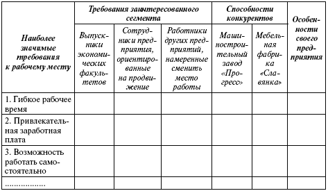Разработка таблицы по предлагаемому макету Мюльбахера[103] позволяет получить информацию о востребованных вакансиях с позиций определенных целевых групп, а также прояснить собственные возможности, обосновать маршрут (или несколько маршрутов), по которому должно двигаться предприятие и который может быть наиболее эффективным с учетом окружения.