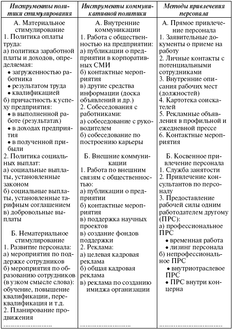 Из-за действия многочисленных ситуативно-значимых факторов трудно найти единственно верный комплекс мер, который обеспечивал бы результативность стратегии в области маркетинга персонала. Оптимальным выходом является комбинирование методов и мероприятий; для этого менеджер по персоналу должен владеть возможным их арсеналом, обосновывая каждую из его составляющих с позиций целесообразности реализации в каждом конкретном случае, включать в план мероприятий. По структуре и содержанию план маркетинга персонала может разрабатываться в различных вариантах. По методике Циммерли[104] он формируется в виде трехэлементной таблицы (табл. 5.13), включающей такие звенья, как инструменты политики побуждения, инструменты коммуникативной политики и методики обеспечения предприятия персоналом.