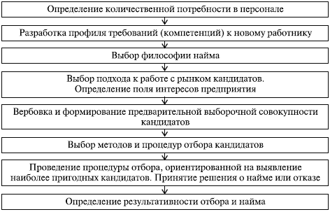Концепция отбора и найма должна быть ориентирована на то, что залогом достижения целей и дальнейшего развития предприятия является своевременное обеспечение его персоналом, владеющим набором соответствующих компетенций. Для реализации такой ориентации концепция предусматривает определенные этапы (рис. 5.7).