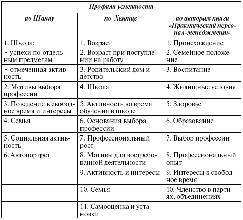 Разрабатываемая строго индивидуально для конкретного предприятия биографическая анкета должна выявить характерный профиль, по которому затем можно было бы определить потенциал пригодности. Для того чтобы сформировать такой профиль, из поля обсуждаемых выбираются отдельные вопросы и выделяются как наиболее важные. Версии таких профилей могут быть разными (табл. 5.24). Определение пригодности кандидата – заключительный этап автобиографического анкетирования – осуществляется через схожесть с идеальным профилем, получаемым из ответов «успешных» работников.