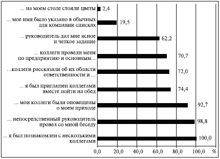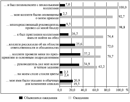Наиболее значимыми для опрошенных стали дружелюбие, приветливость, предупредительность коллег и руководителя, снисходительность и внимание к новичкам. Однако самым трудным или, по мнению руководства компании, самым незначительным для первого дня работы нового работника в кадровой политике явились знакомство новых сотрудников с коллегами, оповещение сотрудников об их приходе и беседа руководителя с новичками в момент их трудоустройства. Ожидания, которые имелись у них по прошествии первой недели трудовой деятельности, наименее оправдались относительно помощи коллег, бесед с руководителем на предмет порученных заданий, а также внимания коллег к наличию пока еще небольшой компетентности.