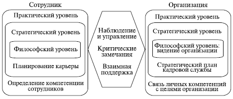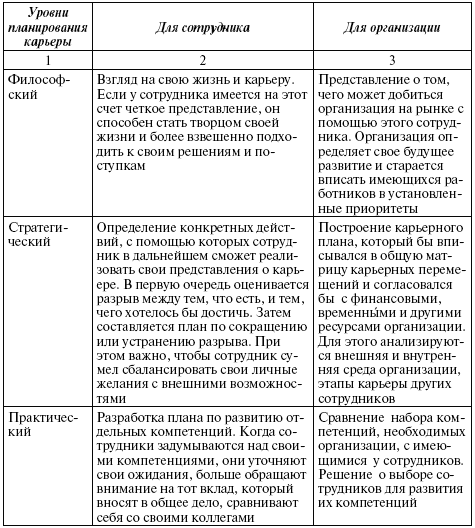 Модель содержит три уровня: философский, стратегический и практический. При этом важным является достижение взаимосвязи между ростом карьеры сотрудника и развитием организации. Планирование карьеры сотрудников будет малоэффективным, если сама организация не развивается и не включает в свои стратегические планы развитие персонала как одно из обязательных условий выживания в конкурентной среде. Расшифровка трех уровней модели для сотрудника и организации представлена в табл. 5.38.