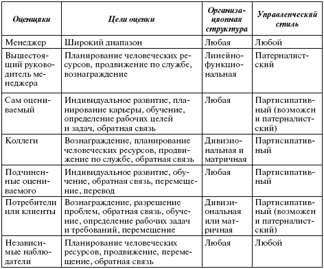 Превалирование патерналистского стиля управления в организации повышает вероятность избрания менеджера единственным оценщиком, что, как известно, может привести к серьезным ошибкам в оценивании. В этом случае желательно подключить к оценке и других возможных оценщиков, а руководителю предоставить выполнение функции координатора и асессора. В организациях с демократическим стилем управления используется гибкий подход к отбору оценщиков. Однако это не означает, что руководитель перекладывает свои обязанности по оценке на других, скорее он разделяет их с ними. В организации руководствуются единственным правилом: оценивает тот, кто владеет большей информацией или экспертными знаниями. В этом случае в системе оценки должен быть предусмотрен механизм объединения результатов оценки, исходящих от разных источников. Как правило, вся информация «стекается» к менеджеру, он аккумулирует ее, ставит итоговую оценку и сообщает об этом подчиненному. При несогласии оценщиков менеджер имеет право решающего голоса.