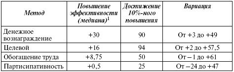 Использование каждого из этих методов сможет привести к различным результатам. Например, согласно Э. Локку (табл. 6.6), оптимальным является денежное вознаграждение (медианное значение прироста производительности 30 %), менее эффективным оказалось использование партисипативных методов (медианное значение прироста производительности 0,5 %).[211]