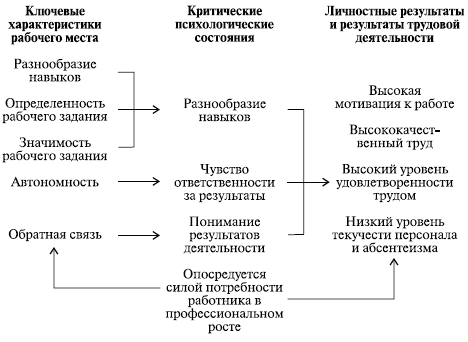 Дальнейшее развитие идей проектирования работы связано с появлением модели характеристик работы Хэкмана и Олдхэма (рис. 6.6). Она основана на взаимосвязи между отдельными характеристиками рабочего места и мотивацией работников. При этом характеристики работы способствуют возникновению определенных психологических состояний, а сила потребности работника к росту создает важный опосредующий эффект.