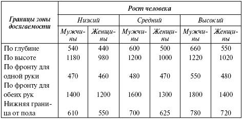 Соблюдение параметров зоны досягаемости при организации рабочего места обеспечивает возможность работать без лишних движений, вызывающих утомление и дополнительные затраты энергии. Наименее утомительна работа в пределах оптимальной рабочей зоны, которая определяется размахом согнутой в локтевом суставе руки. В эту зону помещают наиболее часто используемые инструменты, средства управления. Все остальные размещаются в максимальной зоне, которая описывается размахом вытянутой руки.