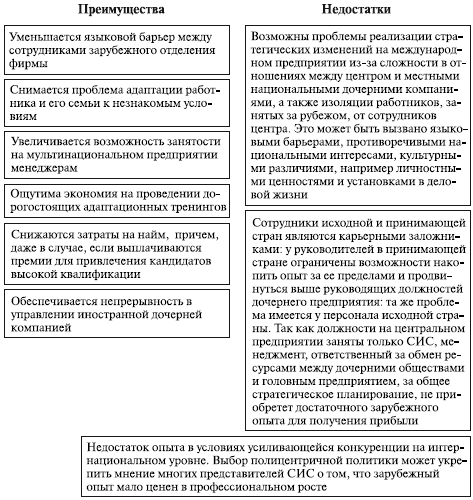 Определяющим отличием полицентричной политики является привлечение для управления дочерними предприятиями персонала принимающей страны (МС), для которого она является родной. Как правило, должностные посты на головном предприятии замещаются своими кадрами (СИС). Выбор полицентричной политики имеет как положительные, так и отрицательные последствия (рис. 8.6).