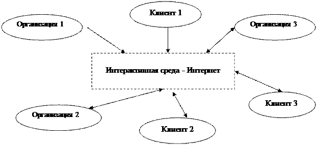 Как следует из данной схемы, с одной стороны, организации, желающие передать потребителям маркетинговое сообщение, непосредственно взаимодействуют с интерактивной средой (Интернет), а, с другой стороны, потребители, ищущие интересующую их информацию, также обращаются к интерактивной среде. Таким образом, интересы организаций и их целевых потребителей встречаются в Глобальном информационном пространстве. Также весьма характерным для рассматриваемой модели является положение о том, что потребители сами поставляют интерактивной среде различную информацию, которой могут воспользоваться как другие потребители, так и организации.