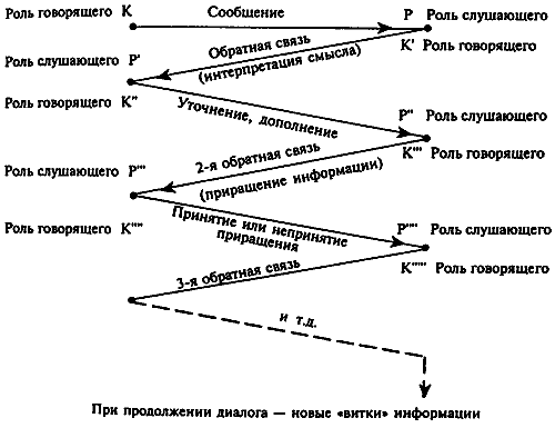 Точность понимания слушающим смысла высказывания может стать очевидной для коммуникатора лишь тогда, когда произойдет смена "коммуникативных ролей" (условный термин, обозначающий "говорящего" и "слушающего"), т.е. когда реципиент превратится в коммуникатора и своим высказыванием даст знать о том, как он раскрыл смысл принятой информации. Диалог, или диалогическая речь, как специфический вид "разговора" представляет собой последовательную смену коммуникативных ролей, в ходе которой выявляется смысл речевого сообщения, т.е. происходит то явление, которое было обозначено как "обогащение, развитие информации". Это хорошо видно на рисунке.