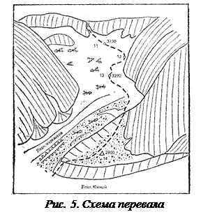 В горном туризме особую важность представляет прохождение перевалов. На их долю и приходится максимальное количество схем. Схемы перевалов принято исполнять не в виде топографической проекции, а подобно фотографии, то есть с такой точки, когда перевал проецируется на вертикальную плоскость, а наблюдатель находится на некотором расстоянии от подходов к перевалу и самого перевала. Такая схема изображена на рис. 5.