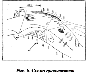 При изображении переправ необходимо указывать, прежде всего, ориентиры, позволяющие однозначно найти место переправы. Таких ориентиров должно быть несколько, причем в качестве ориентиров следует выбирать такие, вероятность исчезновения которых мала, - отдельно стоящие деревья, характерные скалы, вершины и т.п. Ориентиры должны быть как дальние, рассчитанные на видимость в хорошую погоду, так и ближние, которые можно использовать в плохую погоду. На схеме переправы указывают предпочтительный путь движения, расстановку страхующих по берегу, точки закрепления веревок, если веревкой пользовались. Схема переправы приведена на рис. 6.