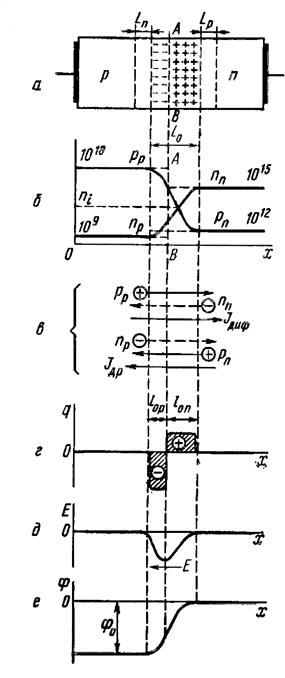 Основой полупроводниковых устройств является электронно-дырочный переход (p - n переход). Это переходный слой между двумя областями полупроводника, одна из которых имеет электропроводность p -типа, а другая – n -типа. P - n переход получают в едином кристалле полупроводника путем легирования его донорной и акцепторной примесями. Слева от границы раздела (рис. 6) электронов меньше, чем справа, поэтому они стремятся дифундировать в р -область. Попадая в р -область они рекомбинируют с дырками и их концентрация быстро падает. Аналогично дырки переходят в n -область и тоже рекомбинируют с электронами. В силу этого имеет место ток диффузии