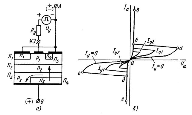 Симистор - представляет собой структуру, в которой при любой полярности создаются условия, соответствующие прямой ветви вольт-амперной характеристики обычного тиристора. Верхний слой металлизации связывает слои n 1, p 1, n 4. Нижний слой металлизации объединяет слои p 2 и n 3. Пусть тиристор закрыт и на аноде положительный потенциал. Переходы П2 и П4 смещены в прямом направлении, П3 - в обратном. Все внешнее напряжение приложено к переходу П3. При подаче положительного импульса на управляющий электрод переход П5 смещается в прямом направлении и инжектирует электроны из слоя n 4 в слой p 1. Эти электроны диффундируют к переходу П2, ускоряются им и входят в слой n 2, снижая его потенциал относительно слоя p 1. Прямое напряжение на переходе П2 растет, дырки из слоя p 1 инжектируются в слой n 2. Затем дырки ускоряются полем перехода П3 и перебрасываются в слой p 2. Поскольку поле перехода П4 тормозит дырки, они переходят в вывод В через слой p 2. Падение напряжения от тока через слой p 2 увеличивает прямое смещение перехода П4. Растет поток электронов из области n 3 в область p 2 и далее в n 2, что увеличивает поток дырок в направлении вывода В. При подаче напряжения обратной полярности структура n 1 - p 1 - n 2 - p 2 работает как обычный тиристор.