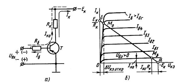 Рис. 68. Схема транзисторного ключа и вольтамперные характеристики транзистора.