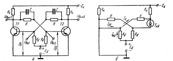 Рис. 71. Принципиальна (а) и эквивалентная (б) схемы симметричного триггера.
