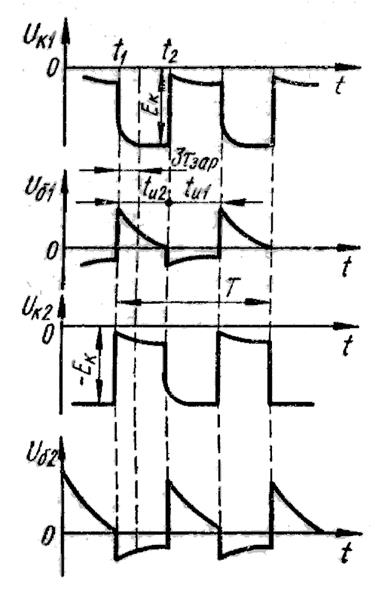 Конденсаторы С б1 и С б2 входят во времязадающие цепи совместно с резисторами R б1 и R б2. Выходом являются коллекторные цепи Т1 и Т2.