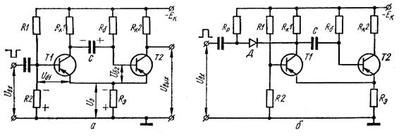 При поступлении на базу Т1 отрицательного запускающего импульса с амплитудой, большей, чем U б1, транзистор начинает отпираться и отрицательное напряжение на его коллекторе снижается. Это приращение через конденсатор С передается на базу транзистора Т2, запирая его и уменьшая ток эмиттера. Отрицательное приращение напряжения на R э, равное (U R2 – U э), прикладывается к базе Т1, отпирая его еще больше. Этот лавинный процесс заканчивается запиранием Т2 и насыщением Т1. Схема приходит в квазистационарное состояние.