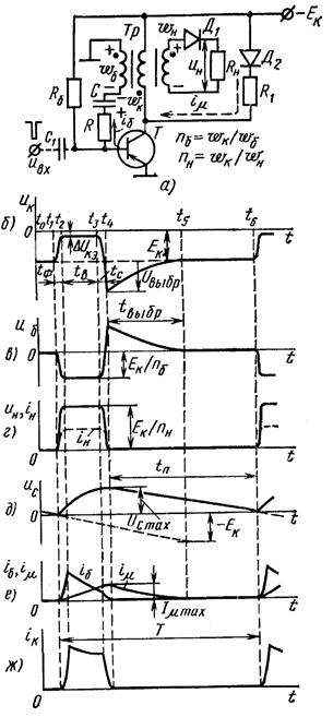 На Рис. 76 приведена схема блокинг-генератора с времязадающим конденсатором. Положительная обратная связь осуществляется с помощью обмотки трансформатора w б, конденсатора С и резистора R. Нагрузка может подключаться к коллектору, или к специальной выходной обмотке w н. В последнем случае обеспечивается потенциальное разделение цепей и возможно изменение амплитуды импульсов за счет подбора соответствующего коэффициента трансформации. Диод Д1 служит для исключения в нагрузке отрицательной полуволны выходного сигнала. Цепь Д2 - R 1 защищает транзистор от перенапряжений в момент закрытия.