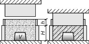 При прессовании плоской жесткой прессовой колодкой опоки с моделью, имеющей объем V м (м3) (рис. 14), условие постоянства массы смеси до и после прессования будет иметь вид: