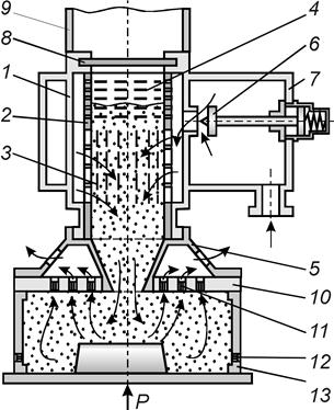 Смесь в гильзу 1 подается из дозатора 9 при открывании шиберного затвора 8. Закрытый шибер герметизирует гильзу и пространство вокруг нее.