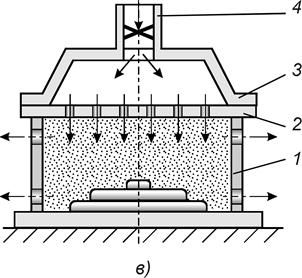 При импульсном процессе опоку с наполнительной рамкой устанавливают на модельную плиту. В опоку засыпают смесь и к наполнительной рамке прижимают герметичную камеру. Затем за 0,01¸0,1 секунды повышают давление газа в камере над смесью. Газ с большой скоростью фильтруется через смесь. В смеси возникают сжимающие напряжения, и форма уплотняется.