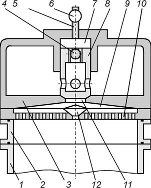 Основными узлами головки являются воздушный ресивер 1, импульсный клапан 2 с широкой тарелкой 3 и дроссель 4. Особенность конструкции клапана заключается в том, что в плите-рассекателе 4 и тарелке клапана 3 выполнены отверстия, не совпадающие друг с другом. Поэтому, когда тарелка прижата к плите, воздух из ресивера не попадает в форму. Для того чтобы выровнять плотность столбов смеси над моделью и вокруг нее предусмотрен дроссель 5 в виде плиты с отверстиями.