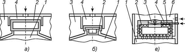 Как уже было сказано, интенсивность подъема давления воздуха над смесью в значительной степени зависит от конструкции клапана. Клапан, показанный на рис. 33, прост по конструкции, хорошо работает в головках высокого давления, где его быстрое открывание обеспечивается большим перепадом давления. В головках низкого давления перепад значительно меньше, поэтому скорость движения клапана невысокая. Для того чтобы обеспечить интенсивный подъем давления, необходимо увеличить диаметр выпускного отверстия, соответственно необходимо увеличить диаметр тарелки 2 клапана (рис. 34, а). Для уменьшения массы тарелки следует уменьшить ее высоту. Между тарелкой и стенкой камеры 4 над клапаном оставляют зазор, чтобы уменьшить силы трения. Поток воздуха, движущийся в зазоре, направляет тарелку и ускоряет ее движение вверх.