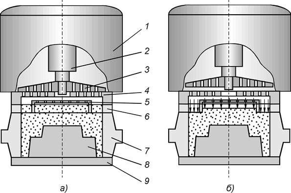В настоящее время применяют два вида импульсного уплотнения – пневмоимпульсное и газоимпульсное (взрывное). Соответственно существует два типа импульсных головок. В корпусе 3 пневмоимпульсной головки (рис. 33) помещен клапан 8, перекрывающий выпускное отверстие 11. На нижнем фланце корпуса закреплена решетка рассекателя 10 с дефлектором 12. К нижней поверхности решетки рассекателя прижимается наполнительная рамка 2, поэтому размеры решетки должны соответствовать размерам опоки 1. Полость корпуса 3 служит ресивером для сжатого воздуха, который подводится (в данной конструкции) по трубопроводу 5 через обратный клапан 4. При повороте крана 6 подача воздуха в ресивер прекращается, сжатый воздух из полости 7 над клапаном выходит в атмосферу, под действием давления воздуха в ресивере клапан резко отбрасывается вверх. Сжатый воздух через выпускное отверстие 11 и полость 9 рассекателя попадает в пространство над смесью и уплотняет ее.