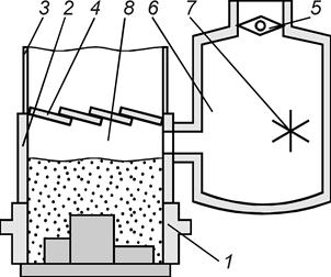 Известна следующая конструкция автоматов линии фирмы G. Fischer (Швейцария). Опоку 1 (рис. 36) прижимают к головке 2, которая одновременно выполняет функции наполнительной рамки. Над головкой установлен бункер 3, устье которого закрыто жалюзийным затвором 4. Жалюзи открывают, и формовочная смесь из бункера сыплется в опоку и наполнительную рамку. Затем жалюзи поворачивают в исходное положение, плотно закрывая камеру 8. Камера 8 соединена с камерой 6, в которую подается газ. Масса газа зависит от давления и времени открытия клапана 5. Газовоздушную смесь поджигают электрической искрой. Начинается быстрое горение газа, давление газа в камерах 6 и 8 резко возрастает; происходит импульсное уплотнение смеси. Максимальное давление газа над смесью в момент сгорания в описанной головке 0,45¸0,5 МПа; время подъема давления 0,005 с.