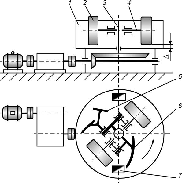 Катковые смесители (бегуны) имеют неподвижную чашу 1 (рис. 38) и два гладких катка 2 (посаженные на оси 4), которые катятся по слою смешиваемого материала вокруг центрального вертикального вала 3. При помощи плужков 5 и 6 смешиваемый материал направляется под катки. Катки смонтированы на кривошипах таким образом, что при попадании под них случайных твердых предметов могут приподниматься и пропускать последние.