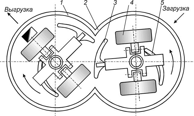 Катковые смесители непрерывного действия(рис. 39), состоят из двух смежных чаш 1 и 2, имеющих проем в месте сопряжения. Механизмы смешивания в чашах синхронно вращаются в противоположные стороны, перемешивая материалы и передавая их из одной чаши в другую. Составляющие смесь материалы подаются непрерывно в правую чашу, где вращающиеся скребки 3 подхватывают загруженный материал и перемещают его к каткам 4 и далее к боковой поверхности чаши плужками 5.