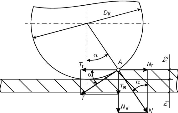 В точке A действуют две основные силы: сила нормального давления катка на смесь N, направленная по радиусу, и перпендикулярная ей сила трения T между катком и смесью, определяемая соотношением