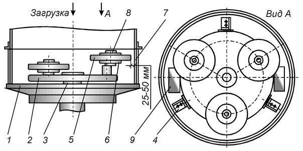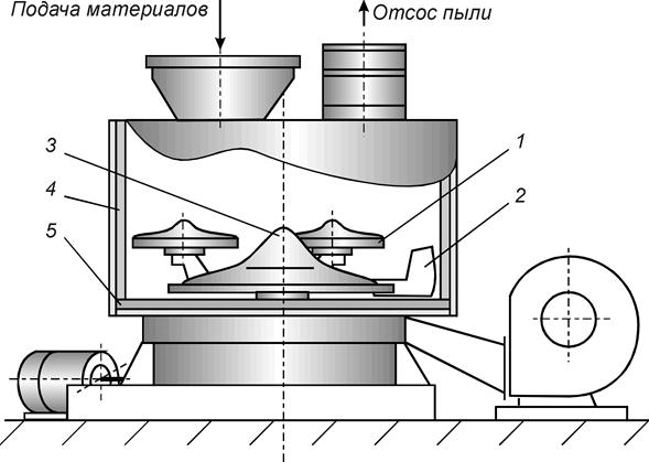 При вращении ротора жестко связанные с ним плужки направляют поток смеси на боковую поверхность чаши под катки. Под действием центробежных сил и давления катков происходит интенсивное перемешивание смеси. Зазор между катками и боковой поверхностью чаши регулируется: чем он меньше, тем интенсивнее разрыхление комьев. Дно чаши облицовано стальными сменными пластинами 5, а боковая поверхность чаши и катки покрыты резиной 4. Резиновое покрытие исключает дробление зерен смеси и ее скольжение относительно стенок чаши, улучшая процесс перемешивания. На рабочей поверхности плужков наплавлен карбид вольфрама, что обеспечивает их высокую износостойкость. Зазор между плужками и дном чаши 1¸1,5 мм.