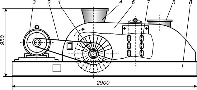 Основанием машины служит сварная рама 8, на которой установлены подшипники вала ротора 1 и электродвигатель 3, передающий вращение через клиноременную передачу 2. На роторе 1 смонтировано шестнадцать пар державок, на каждой из которых закреплена сменная лопатка. В средней части сварного защитного кожуха 6 свободно подвешены в два ряда цепи 7. Кожух имеет в верхней части загрузочную воронку 4 с двумя заслонками для регулирования потока смеси и вентиляционный патрубок 5 для отсоса пыли.