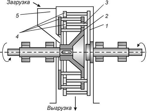 Дезинтеграторы или дисковые разрыхлители (рис. 44) состоят из двух вращающихся навстречу друг другу дисков 1 и 2, на которых укреплены пальцы 3. Привод дисков индивидуальный, а приводные валы могут располагаться либо с одной стороны установки, либо с двух сторон, как это показано на рис. 2.36. Пальцы каждого ряда для увеличения жесткости соединены между собой кольцами 4. Материал для помола подается через воронку 5 в центральную часть установки.